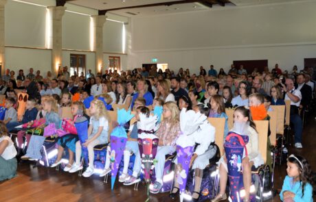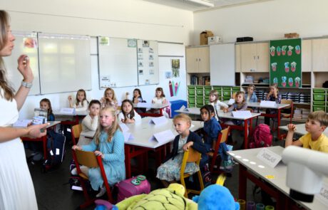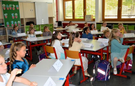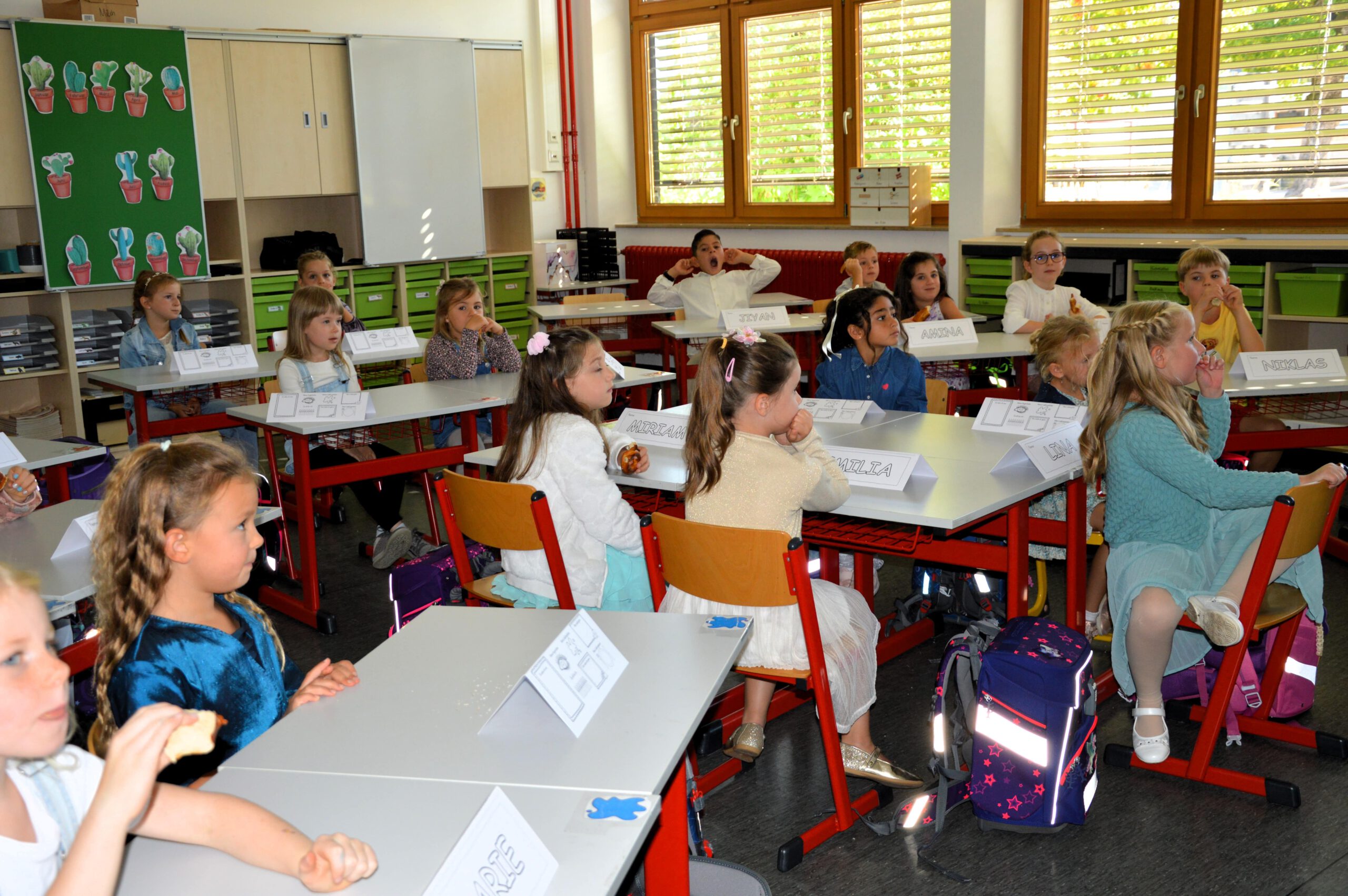 Begleitet von ihren neuen Klassenlehrerinnen Frau Lisa Uhl (GS1aB), Frau Kess (GS1bB), und Frau Gseller (GS1Z) machten sich die einzelnen Klassen – beladen mit Schulranzen und Schultüte – auf in ihr jeweiliges Klassenzimmer, in dem das erste Kennenlernen stattfand.